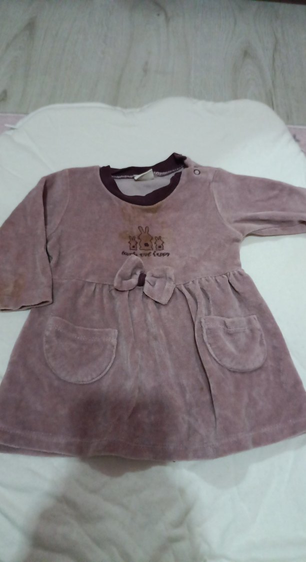 Kız çocuk elbisesi uzun kollu, yuvarlak yakalı ve bol kesimdir. Yumuşak ve sıcak kumaştan, mat kahverengi tonunda, baskılı ve düğmeli detaylara sahiptir. Önünde iki cep ve fiyonk bulunur.