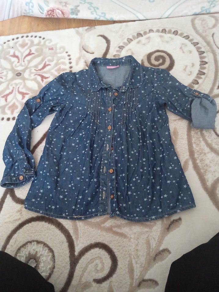 Gri yıldız desenli mavi renkte, düğmeli ve yakalı, bol kesim uzun kollu kız denim bluz. Bohem stilde rahat bir tasarıma sahiptir. LC 7-8 yaş kot gomlek