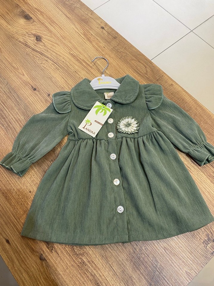 Uzun kollu, düğmeli ve bol kesim kız elbisesi, yumuşak kumaştan yapılmış yeşil renkte. Notlu yaka ve nakış detayları bulunur.