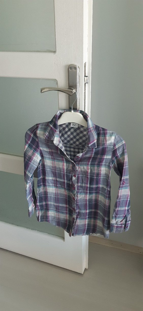 Düğmeli, uzun kollu, yakalı kız gömleği. Mor ve gri tonlarında, rahat kesimli, yumuşak dokulu kumaştan, günlük sokak stili için uygun.eni 38 boy 58