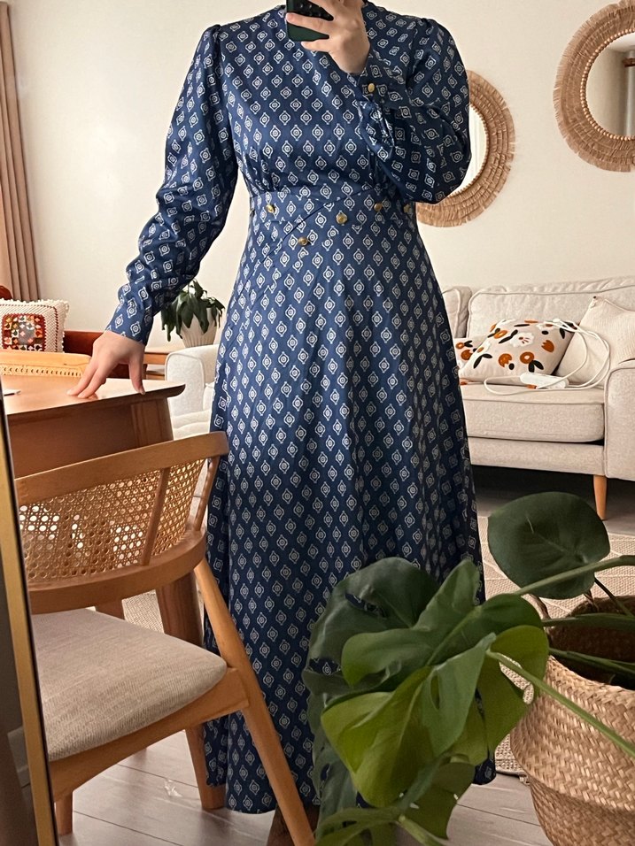 Lacivert uzun elbise, düğmeli ön, yaka detaylı ve uzun kolludur. Sentetik kumaştan, bağlama desenli ve rahat kesimdir. 2 düğme eksik