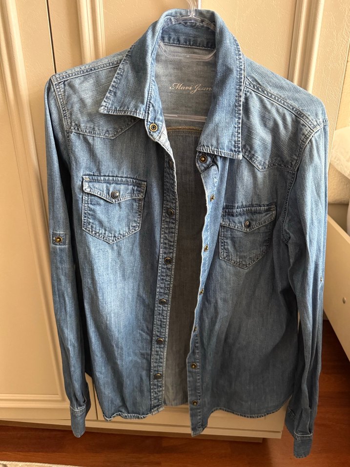 Bol kesim mavi denim gömlek, uzun kollu, yakalı ve düğmeli ceplerle günlük sokak stiline uygun. M beden 2 kez giyildi sıfırdan farksız alısına hayırlı olsun iade yoktur