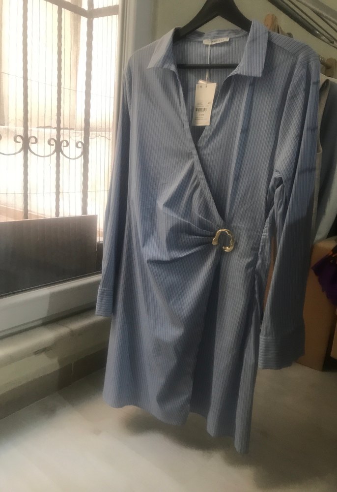Mavi renkli, uzun kollu, düğmeli ve baskılı desenli kadın gömleği. Notlu yaka ve bol kesimiyle ofis için uygun, sentetik kumaştan üretilmiştir.Kenardan fermuarlı