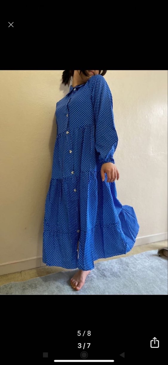 Renkli puantiyeli, uzun kollu, düğmeli ve yüksek yakalı, pamuklu kumaştan yapılmış bol kesim uzun mavi elbise.
