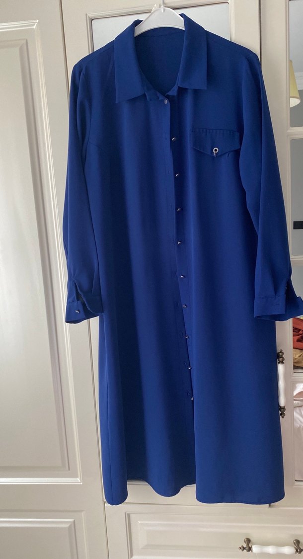 Parlak mavi, ipeksi kumaştan, düğmeli ve uzun kollu, bol kesim tunik. Ofis kullanımı için uygundur. 114 cm boy 42 beden uyumlu