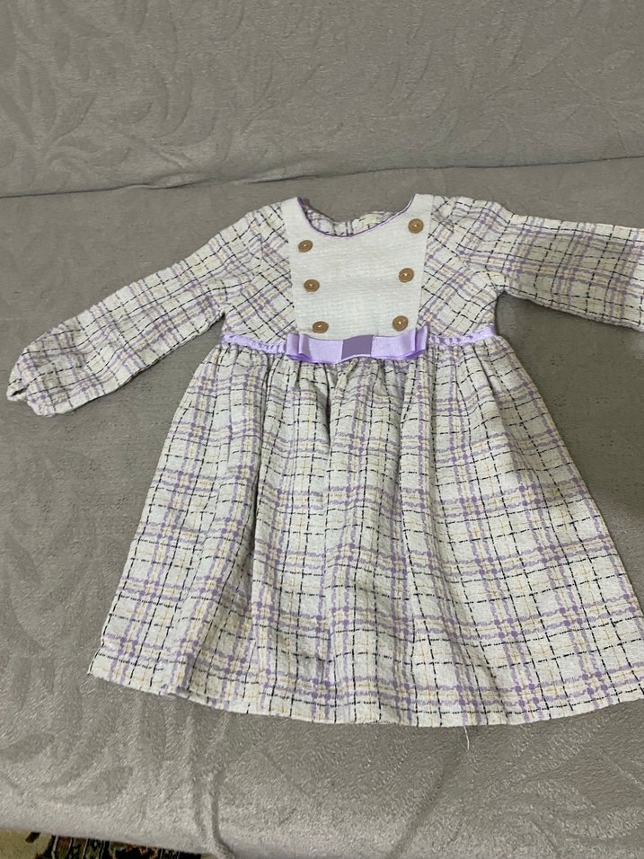 Uzun kollu, düğmeli ve yakası kesimli mor kareli kız elbisesi, belinde kurdele detayı ile modern klasik tarzda, yumuşak sentetik kumaştan yapılmıştır.