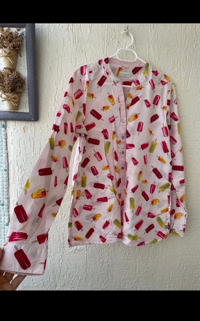 Pamuklu, uzun kollu, düğmeli ve yuvarlak yakalı gömlek. Pastel pembe batik deseniyle bohem tarzına uygundur.