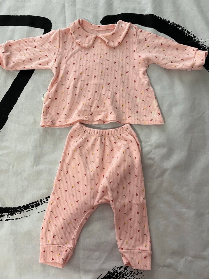 Pastel pembe renkli, uzun kollu ve düğmeli üst ile küçük desenli, yumuşak kumaşlı pantolondan oluşan bebek kız takımı. İkizlerim olduğu için hiç giyilmeden büyüdüler.