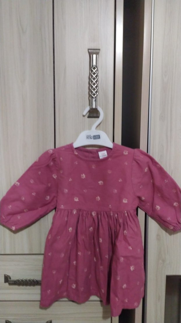Pembe renkli kız bebek elbisesi, uzun kollu, yuvarlak yakalı ve düğmeli detaylara sahip. Tertemiz sorunsuz.