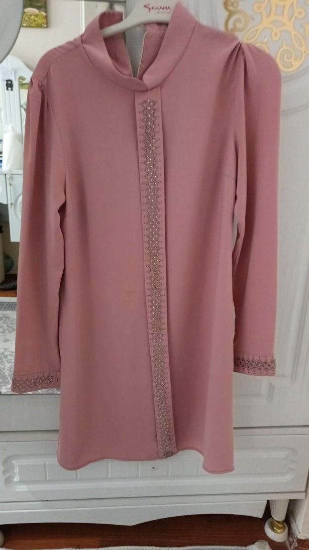 Yüksek yakalı, uzun kollu, düğmeli ve işlemeli detaylara sahip pembe uzun tunik. İpek gibi kumaştan, ofis için uygun, rahat kesim.