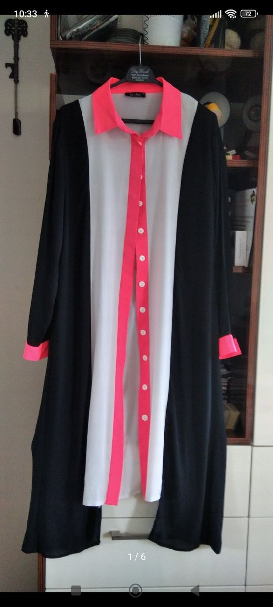 Uzun kollu, düğmeli tunik. Notlu yaka ve bol kesim özelliklerine sahip. Çok renkli, koyu tonlar ve canlı pembe detaylar içerir. Ofis için uygundur.