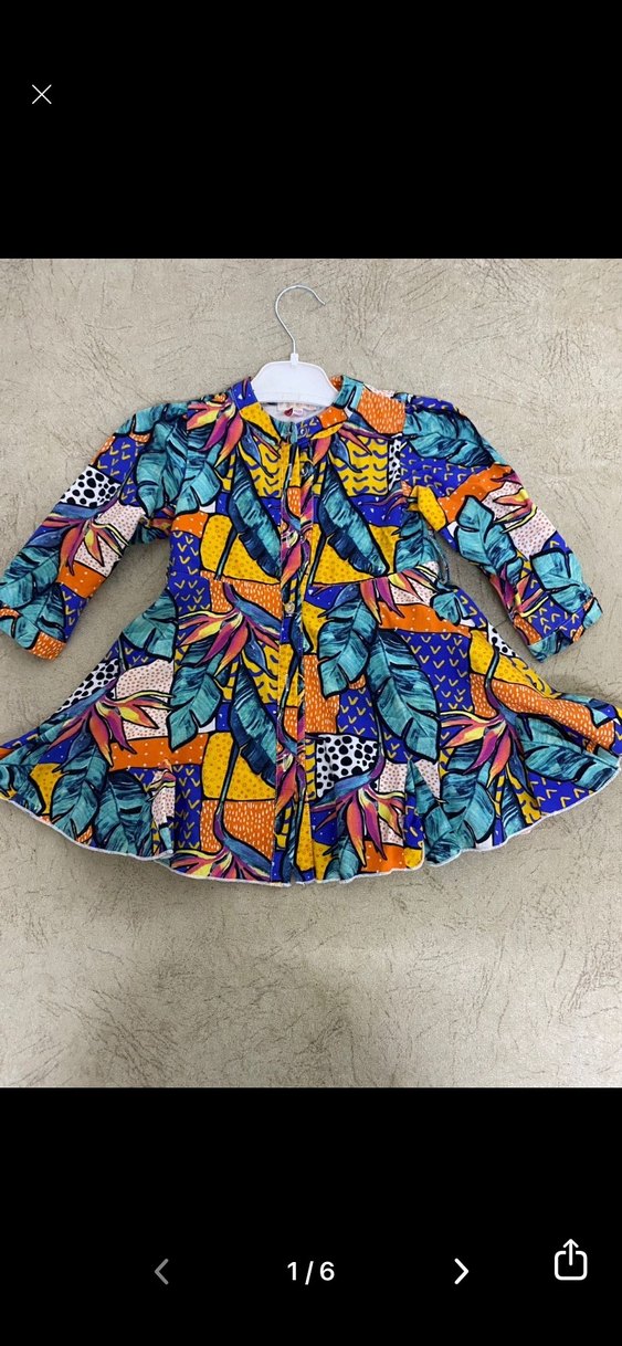 Renkli, uzun kollu, düğmeli ve V yakalı kız elbisesi. Sentetik kumaştan, bol kesim ve bohem desenli.