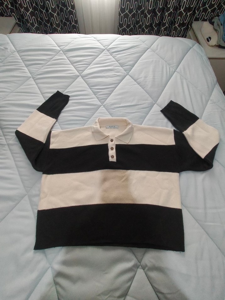 Uzun kollu, düğmeli ve yakalı, siyah beyaz renk bloklu bol kesim sweatshirt. Rahat ve günlük kullanıma uygun.