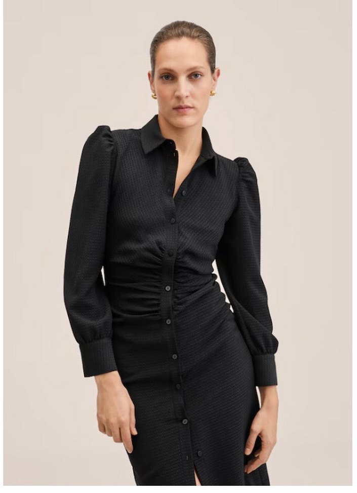 Düğmeli, V yaka, uzun kollu siyah ofis elbisesi. Sentetik, pürüzsüz kumaştan modern kesim.