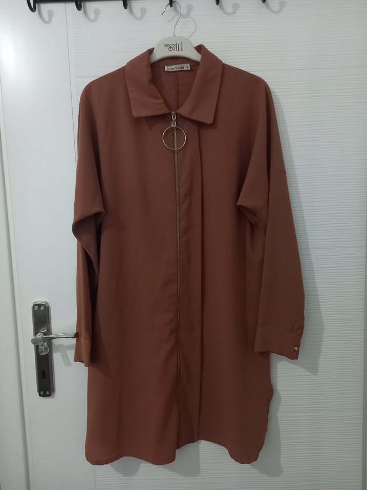 Uzun kollu, düğmeli, yakalı taba tunik, parlak ve ipeksi kumaştan, rahat kesimiyle günlük şıklık sağlar.