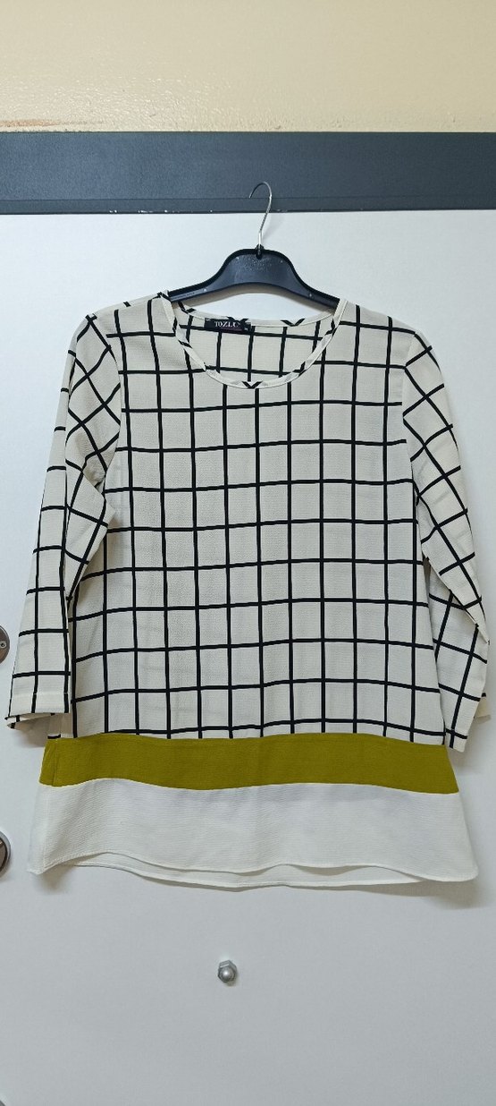 Yuvarlak yaka ve uzun kollu, bol kesim kadın bluz. Beyaz ve gri ekose desenli, alt kısmında beyaz ve zeytin yeşili renk blok detaylı, günlük kullanıma uygun sentetik kumaştan üretilmiştir.