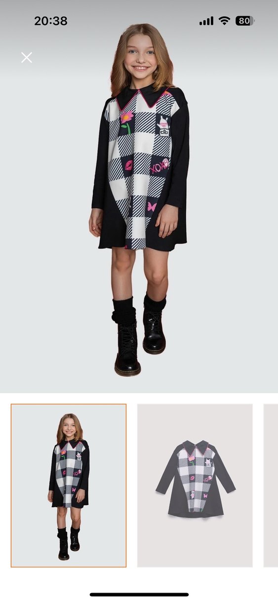 Salaş kesim, uzun kollu ve yuvarlak yakalı kız elbisesi, ekose desen ve pile detaylarıyla. Yumuşak sentetik kumaştan, gri ve siyah tonlarında renkli dokunuşlarla sokak modası tarzında.