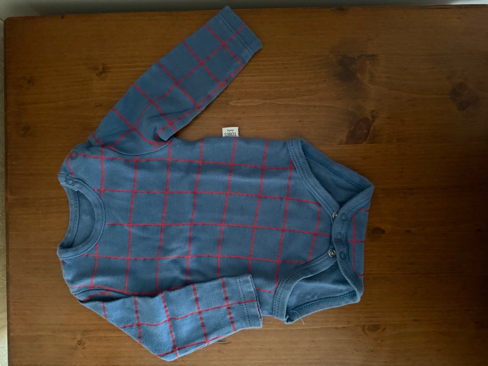 Mavi renkli uzun kollu bebek body, ekoseli desene sahip. Yuvarlak yakalı ve düğmeli, yumuşak denim kumaştan üretilmiştir.
