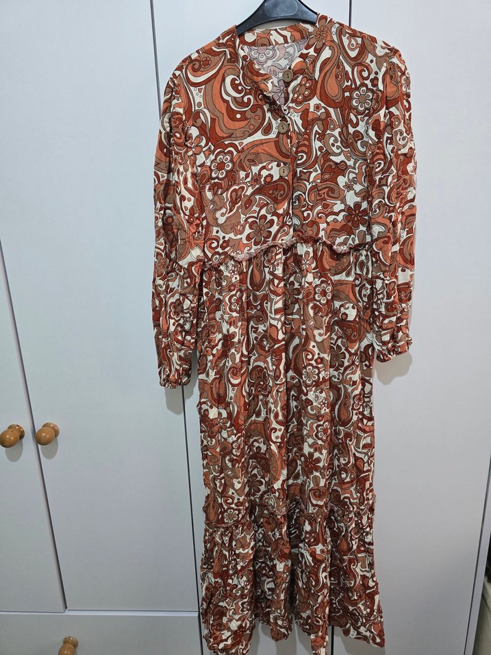 Kahverengi bohem uzun elbise, bol kesim, uzun kollu ve yüksek yakalıdır. yumuşak sentetik kumaştan, günlük kullanıma uygundur.Hiç giyilmedi