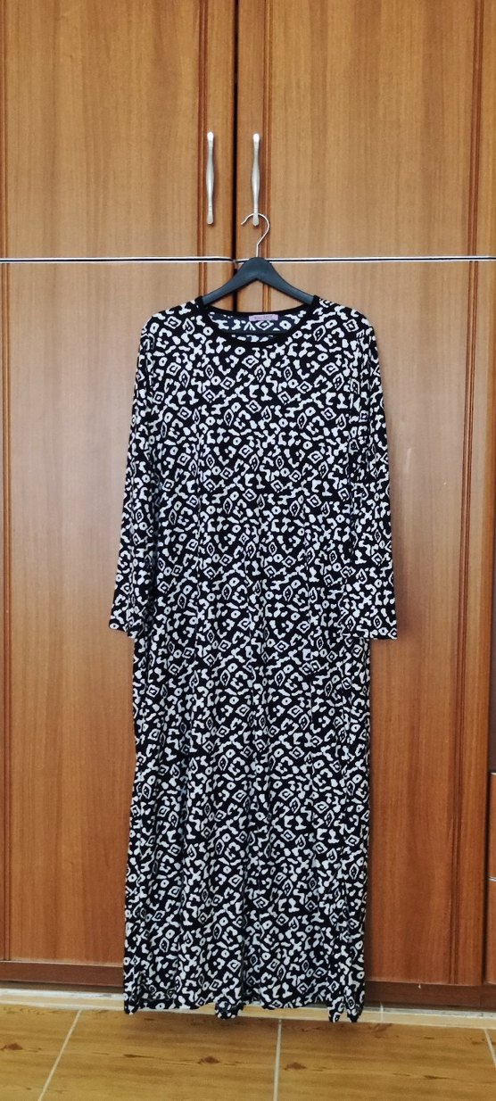 Rahat kesim,yuvarlak yaka uzun kollu siyah renkli desenli elbise .Sokak stiline uygundur. 3XL Beden.