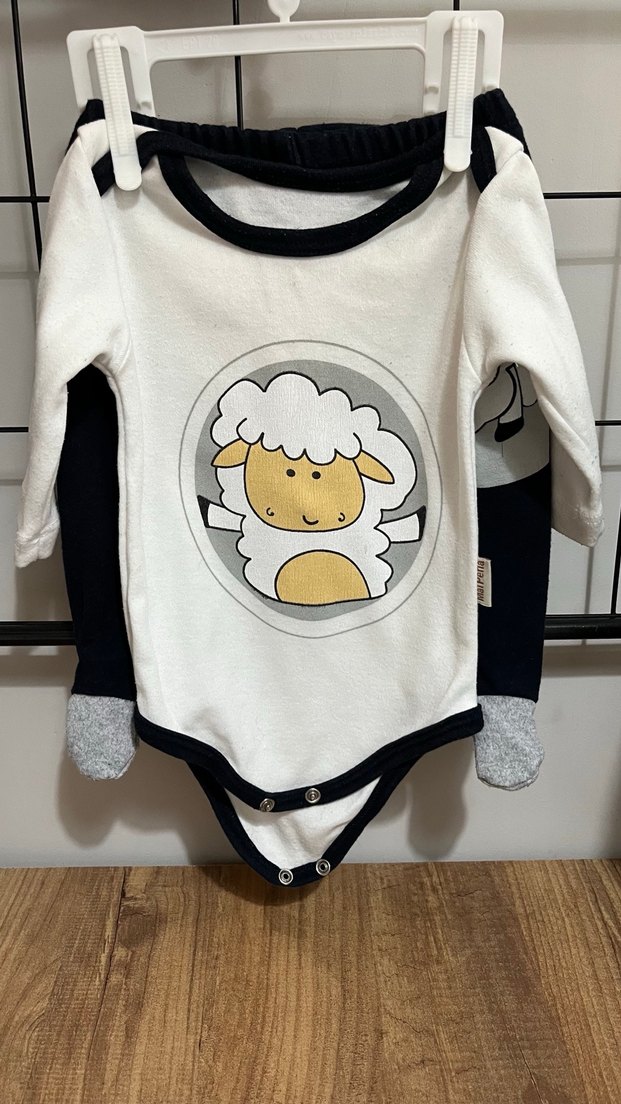 Uzun kollu, yuvarlak yakalı erkek bebek body, yumuşak ve sıcak kumaş, örme detaylı, baskılı koyun deseniyle beyaz ve lacivert renkte, sokak stili için uygundur.