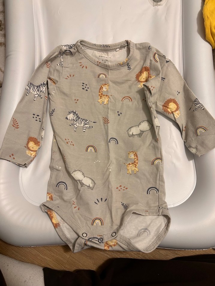 Gri uzun kollu bebek body, yuvarlak yaka ve düğmeli kapanışa sahiptir. Yumuşak kumaşlı, hayvan desenlidir.