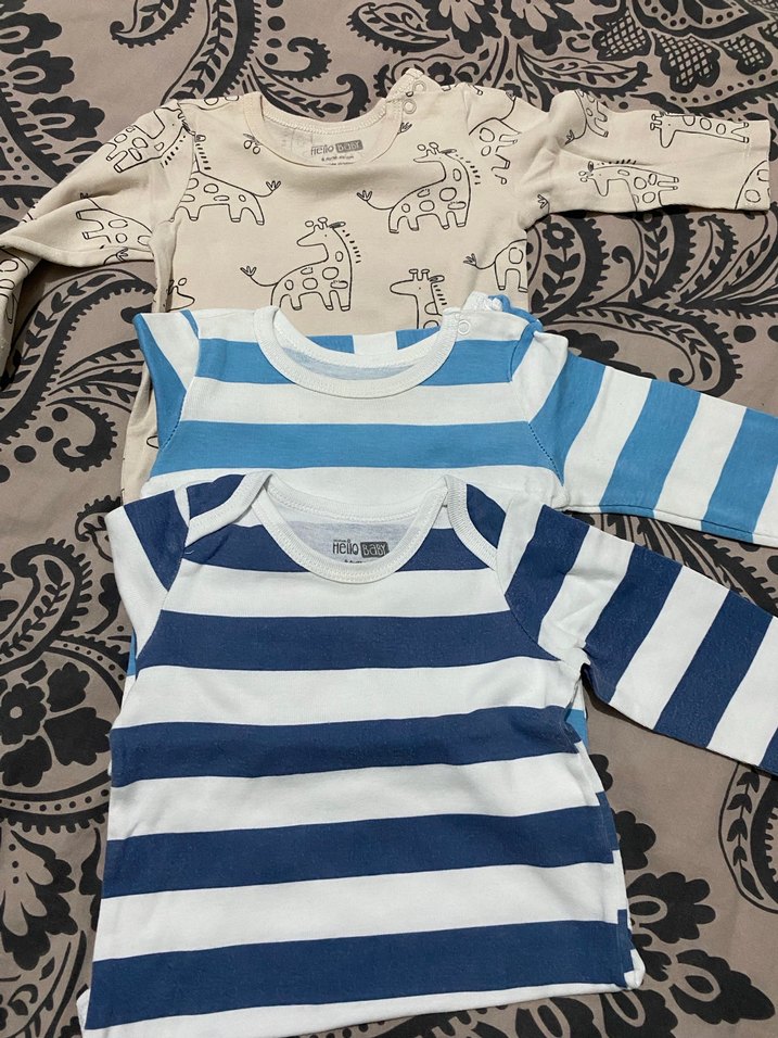 Uzun kollu, pamuklu örgü kumaştan, baskılı ve çizgili desenlere sahip erkek bebek bodyleri, yuvarlak yakalıdır.