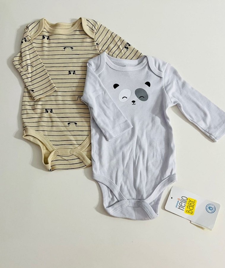 Pamuklu, uzun kollu, crew neck erkek bebek body seti. Beyaz panda baskılı ve bej ince çizgili iki rahat tasarım.