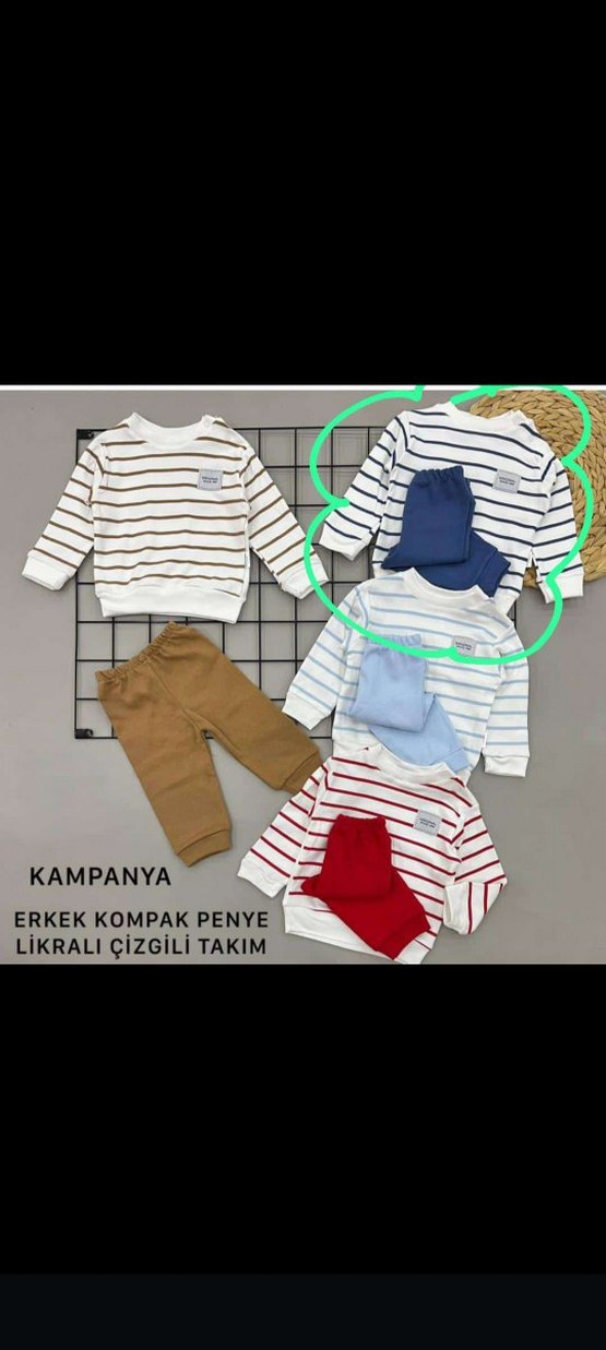 Uzun kollu, yuvarlak yaka, pamuklu ve çizgili örme üst ile uyumlu düz kahverengi pantolon içeren erkek bebek takımı. Rahat ve yumuşak kumaşlıdır.