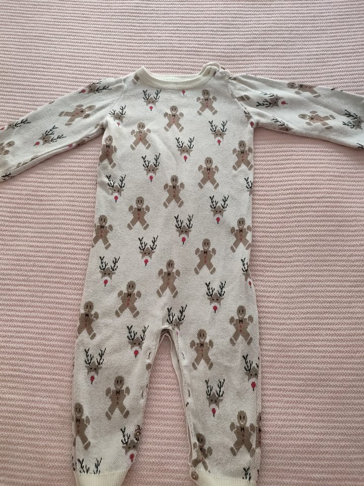 Uzun kollu, kruvaze yakalı kahverengi ve gri örgü bebek tulumu. Üzerinde baskılı zencefilli kurabiye ve geyik desenleri vardır. ❄️ LCW tulum herhangi bir sorunu yok