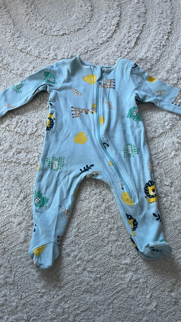 Uzun kollu, yuvarlak yakalı ve önden fermuarlı erkek bebek tulumu. Yumuşak ve sıcak kumaştan yapılmış, mavi zemin üzerine renkli hayvan desenleri bulunur Temiz defosuz