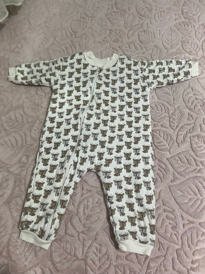 Uzun kollu, bisiklet yaka erkek bebek tulumu, yumuşak triko kumaştan, kahverengi ayı desenli, gri zeminli, sıcak tutar ve konfor sağlar. Az kullanıldı