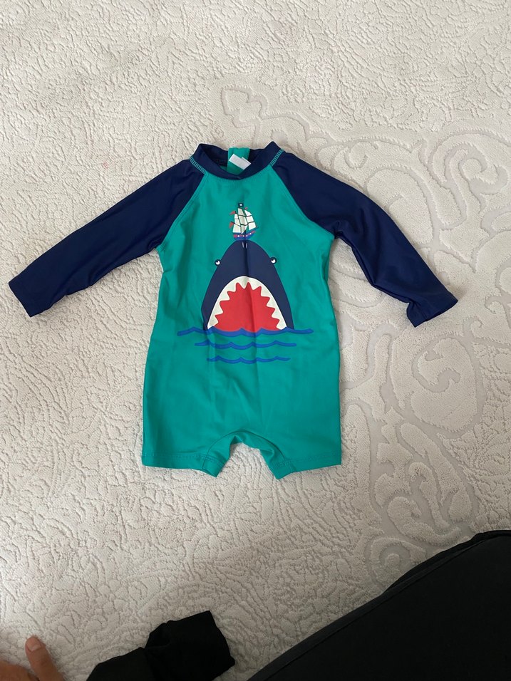Uzun kollu, mavi ve yeşil renklerde erkek çocuk deniz kıyafeti. Renkli köpekbalığı ve gemi baskısı bulunur. Su aktiviteleri için uygun yumuşak kumaş.