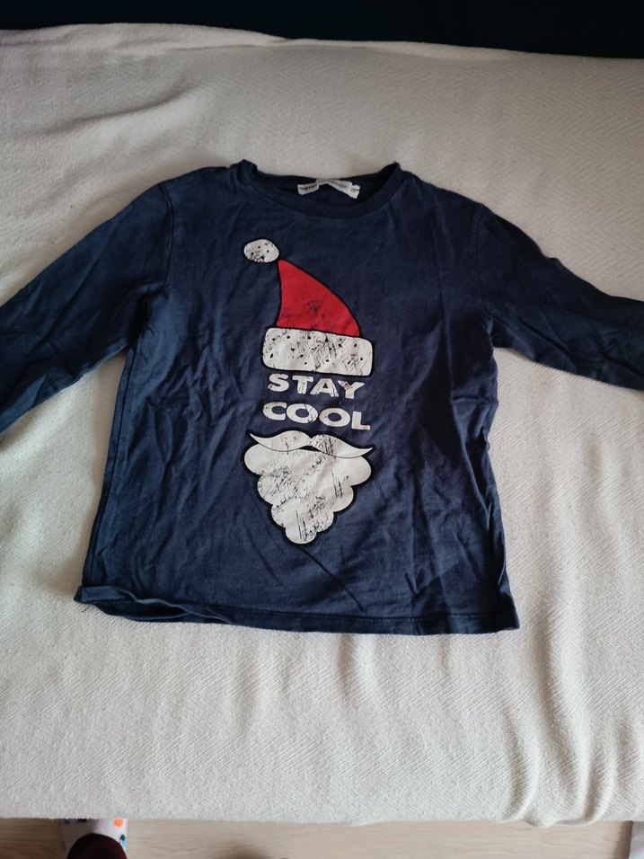 Erkek çocuklar için uzun kollu, bol kesim ve yuvarlak yakalı sweatshirt. Yumuşak, örme kumaştan yapılmış, koyu mavi renkte ve "STAY COOL" yazılı Noel Baba baskılıdır.