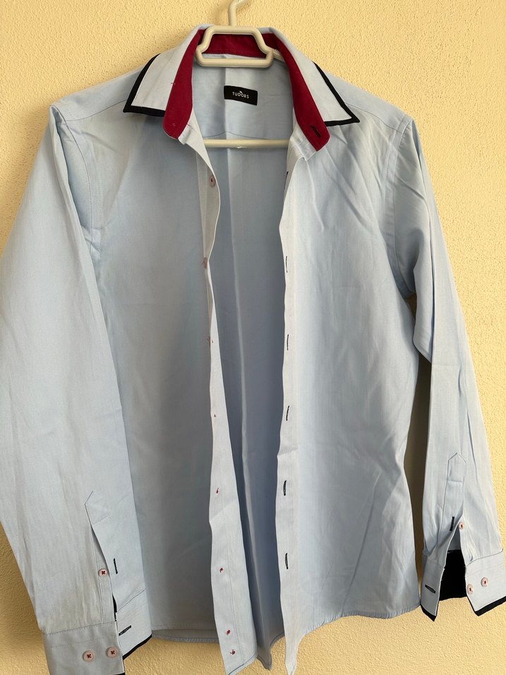 Düğmeli önü ve yakalı, mavi renkte sentetik kumaştan yapılmış uzun kollu erkek gömleği. Ofis kullanımı için uygun, normal boy ve regular kesim.