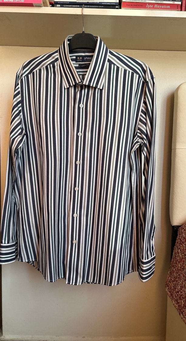 Renkleri Lacivert,beyaz,haki yeşili tonu(açık bir renk), ve koyu yeşil renklerinden oluşmaktadır. Yedek düğmesini de ekledim. L beden. Toplu alımlarda yardımcı olurum.En sonda minik bir leke var yıkanınca geçebilir. Fiyatı ona göre ekliyorum zaten