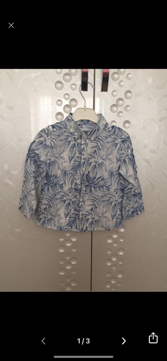 Mavi ve gri tonlarda batik desenli, uzun kollu, düğmeli ve yakalı erkek gömleği. rahat kesim ve günlük sokak stili için uygundur.