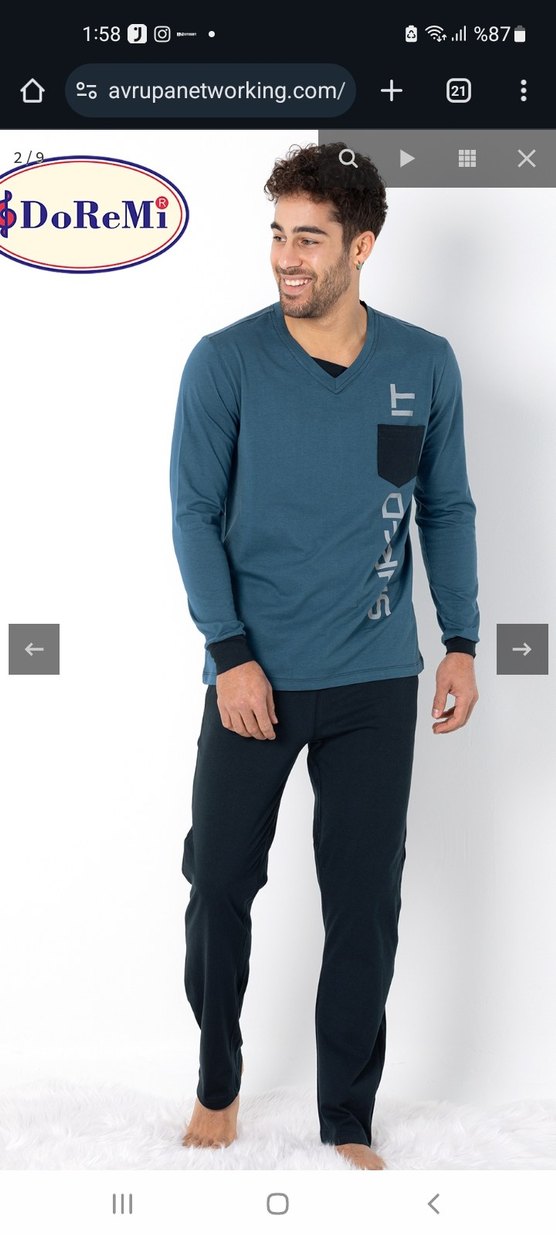 uzun kollu, yuvarlak yakalı üst ve siyah bol kesim pantolonlu erkek pijama takımı. Yırtmaç detayı ve rahat kesimiyle şık bir görünüm sunar. petrol mavisi renk