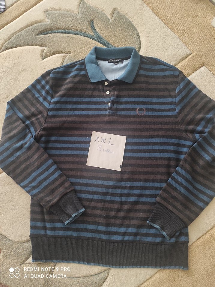Uzun kollu, düğmeli erkek polo yaka tişört. Gevşek kesim, normal boy ve yumuşak sıcak kumaştan. Kahverengi-mavi çizgili, günlük rahat sokak stili için uygun.