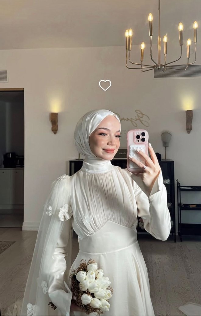 Yüksek yakalı, uzun kollu, etnik desenli beyaz abiye. Şeffaf detaylarıyla sade ve bohem tarzda, modest kesimle hazırlanmıştır. 36 42 bden aralığı olup şal dahil fiyatıdır tarih sorunuz