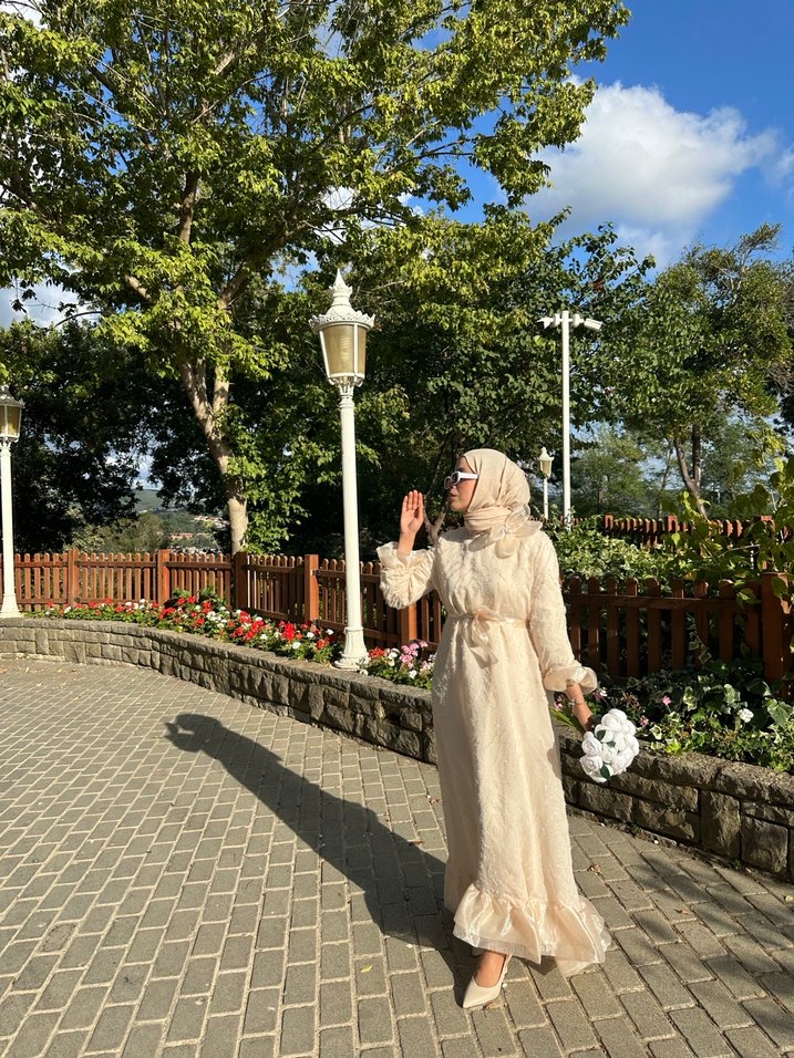 Beyaz uzun elbise, yüksek yaka ve uzun kollu, bol kesim ve drapeli tasarıma sahiptir. Sentetik kumaştan üretilmiş, etnik desenlerle bohem ve sade bir şıklık sunar, düğünler için uygundur.