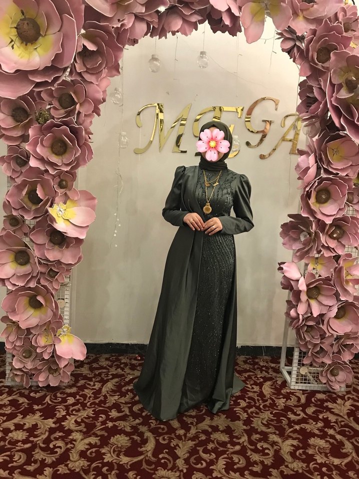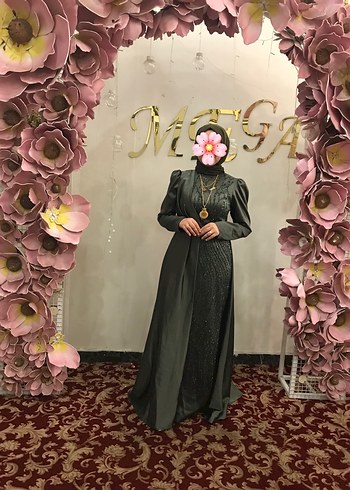 Bu uzun, dar kesim abiye elbise yüksek yakalı ve uzun kolludur. Etnik desenlere sahip olup drapeli tasarımıyla düğün için uygundur. Koyu gri rengiyle mütevazı ve gotik tarzlara uyum sağlar.
