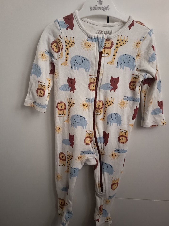 Uzun kollu, ön fermuarlı ve bisiklet yakalı bebek tulumu. Yumuşak ve sıcak kumaştan, renkli hayvan desenli, sokak stili için uygun.