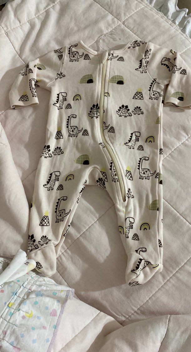 Pastel beyaz renkte, uzun kollu ve yüksek yakalı bebek tulumu. Önden fermuarlı, yumuşak ve sıcak kumaş kullanılmış, dinozor desenli.