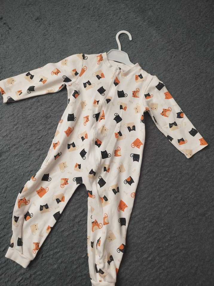 Yumuşak ve sıcak kumaştan, uzun kollu fermuarlı bebek tulumu. Beyaz zemin üzerinde sevimli kedi desenli, rahat ve kullanışlı.