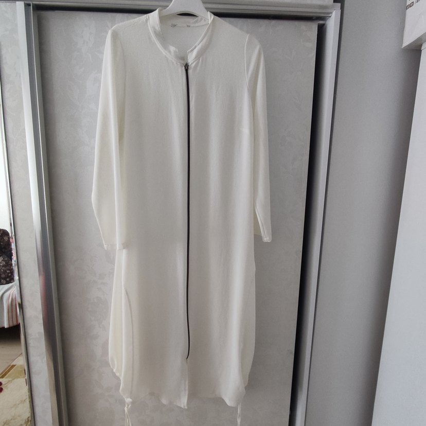 Uzun, bol kesim beyaz tunik, yuvarlak yaka ve ön fermuar detayına sahiptir. Hafif keten kumaştan yapılmış, minimalist ve normcore tarzıyla günlük kullanıma uygundur.