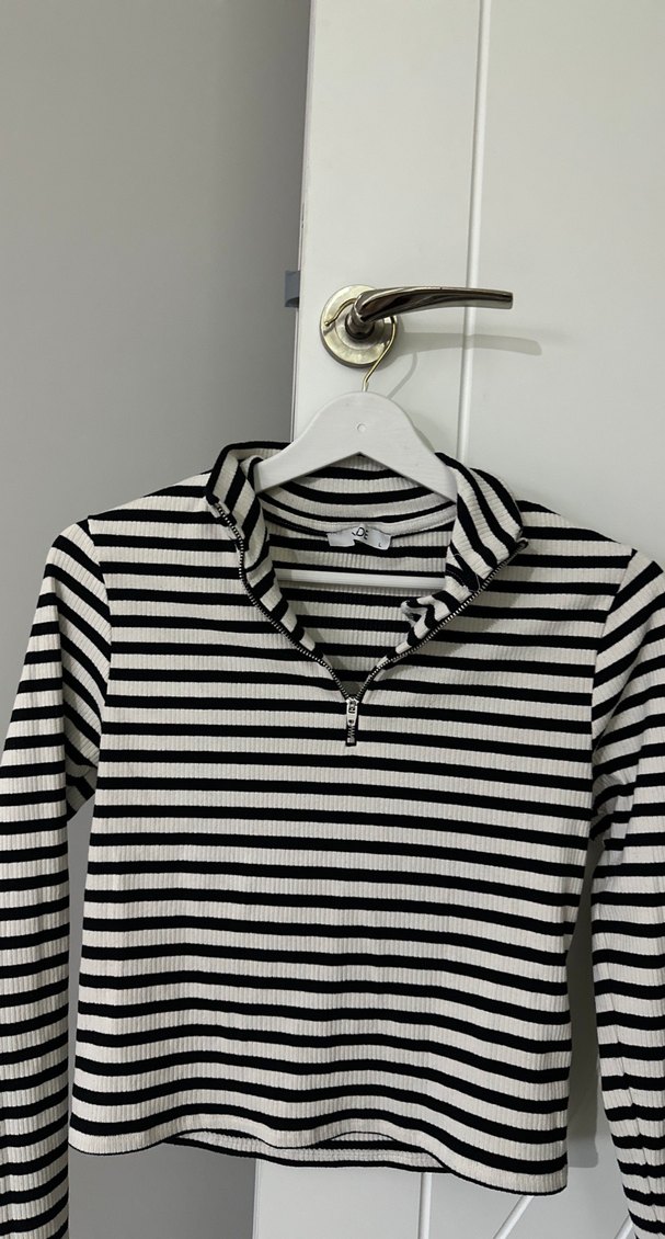 Fermuarlı, uzun kollu, yüksek yakalı, ince kesim çizgili kadın triko. Gri ve beyaz pamuklu kumaştan, günlük kullanıma uygun.