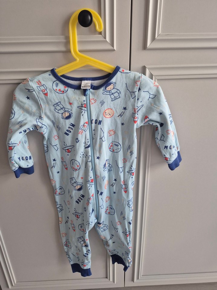 Uzun kollu, bisiklet yaka erkek bebek tulumu, yumuşak ve sıcak kumaştan. Fermuarlı ve mavi-gri tonlarda desenli. minik bir lekesi var durmaktan kaynaklı fotoğratfa görünüyor