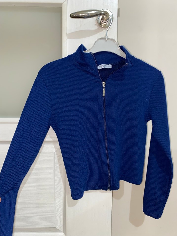 Bu dar kesim kadın kazak, uzun kollu, yüksek yakalı ve ön fermuarlı. Kısa boyda, yumuşak ve sıcak hissettiren koyu mavi polar kumaştan üretilmiştir.
