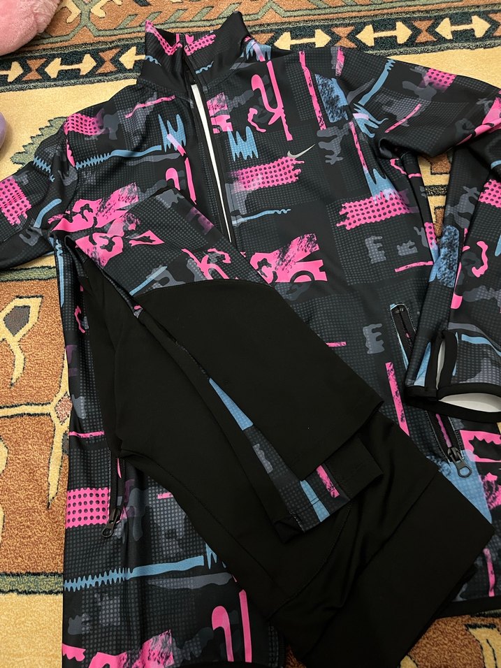 Dar kesim, uzun kollu ve fermuarlı kadın eşofman üstü. Sentetik kumaştan, yüksek yakalı ve pembe desenli, şehir stili ve athleisure için uygun.